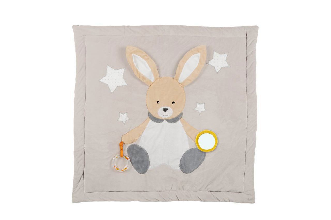 Tappeto morbido e in materiali di qualità con protagonista il coniglietto, realizzato in velour e con molte attività gioco