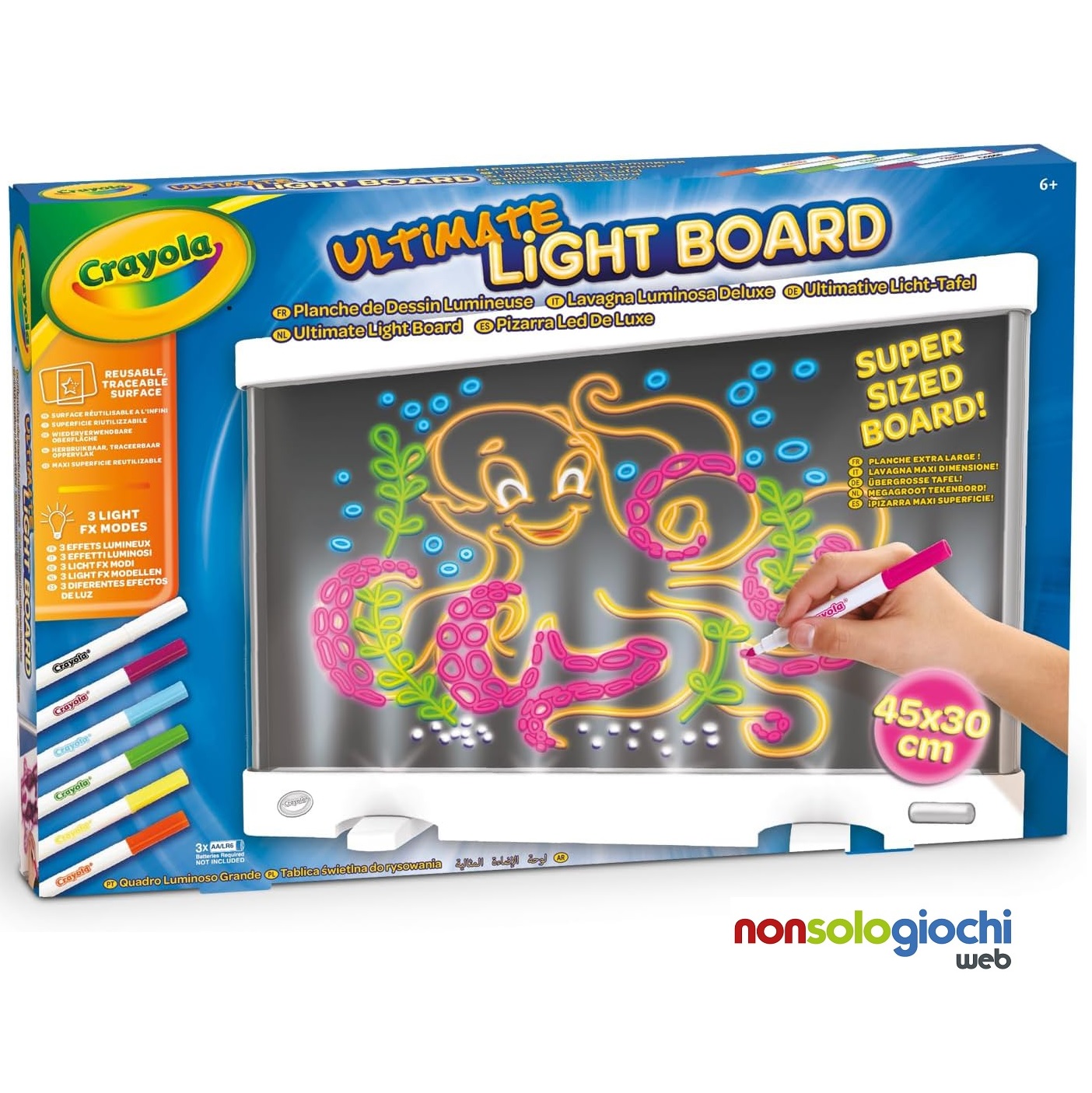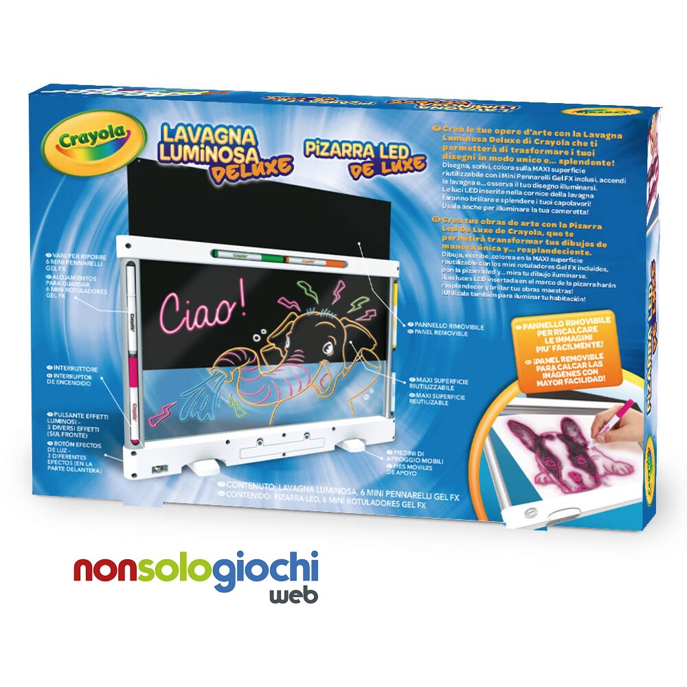 Super lavagna luminosa Crayola per disegnare, scrivere e colorare in modo magico! Con la superficie maxi riutilizzabile e i pennarelli Gel FX inclusi, ogni creazione prende vita grazie alle luci LED integrate nella cornice. Ideale per ricalcare immagini, illuminare la cameretta o creare splendidi disegni luminosi. Un gioco creativo, educativo e spettacolare firmato Crayola!