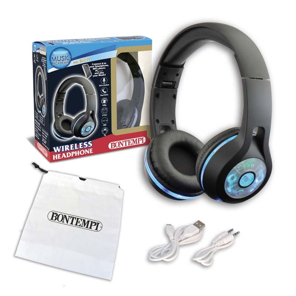 Cuffia wireless con luci led – Regolazione volume – Connessione Wireless (Bontempi49) – Microfono integrato – Presa di connessione ad un lettore MP3 (smartphone, tablet, CD player…), cavetto incluso – Premi il tasto sulla cuffia per rispondere ad una telefonata – Quando la cuffia è connessa ad uno smartphone è possibile riattivare l’ultima chiamata fatta o ricevuta – Presa per ricaricare la batteria al lithio attraverso il cavetto incluso – Autonomia: 3-4 ore – Tempo di carica: circa 1,5 ore – Sacca per cuffia in dotazione – Dim.: 185x85x185 mm