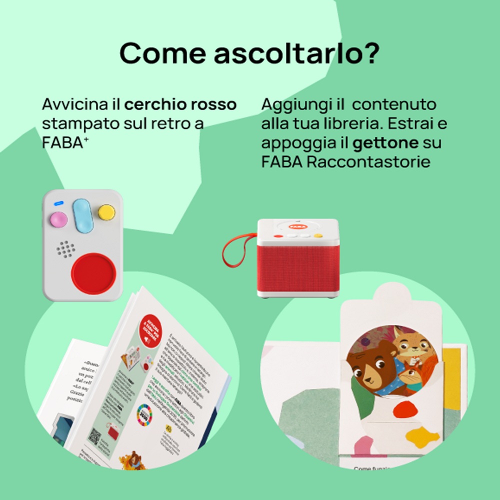 Fiaba sonore FABA: racconti educativi da ascoltare senza schermi. Il personaggio Sonoro trasforma il Raccontastorie in un mondo di avventure, perfetto per gioco, apprendimento e dolci routine della buonanotte