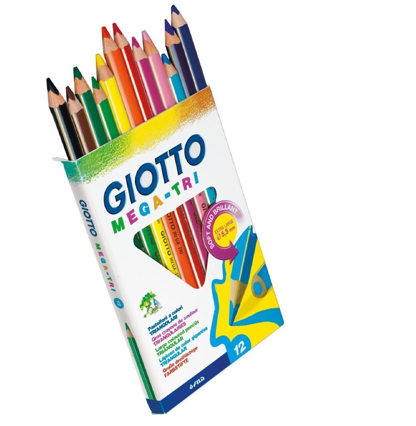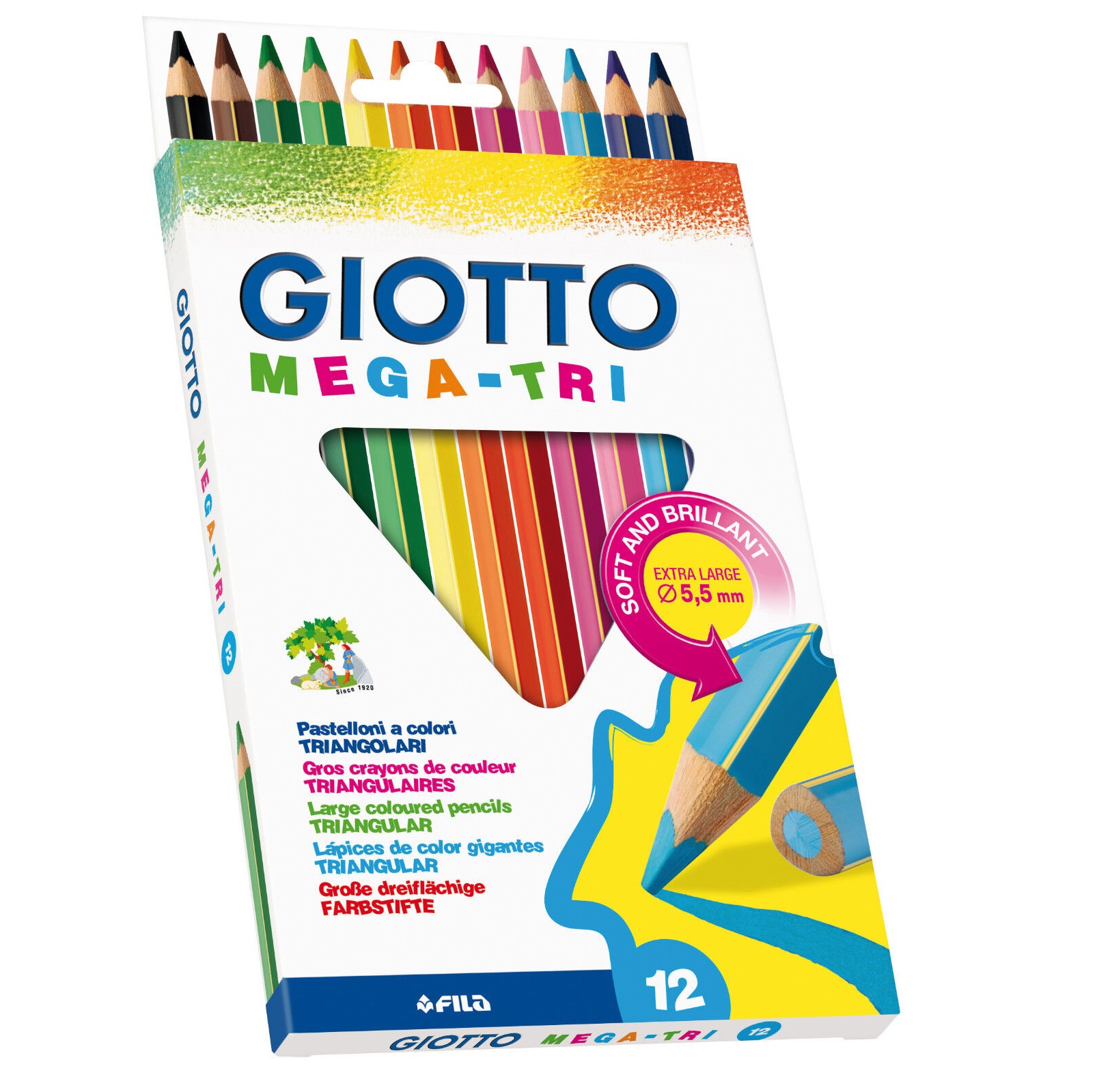 Giotto pastello mega TRI confezione in astuccio da 12 pezzi nei colori CLASSICI. Creatività extra-large. Un grande disegno ha bisogno di una grande matita con una mina gigante e con una forma TRIANGOLARE del pastello. il diametro del pastello è di mm 10. il diametro della mina è di 5,5 mm EXTRA MORBIDA per una grande riserva di colore e una possibilità creativa senza fine. Facile liberare il colore con Giotto Mega Tri, il pastellone gigante TRIANGOLARE verniciato nel colore della mina con spigoli dorati. La lunghezza del pastello è di 18 cm.