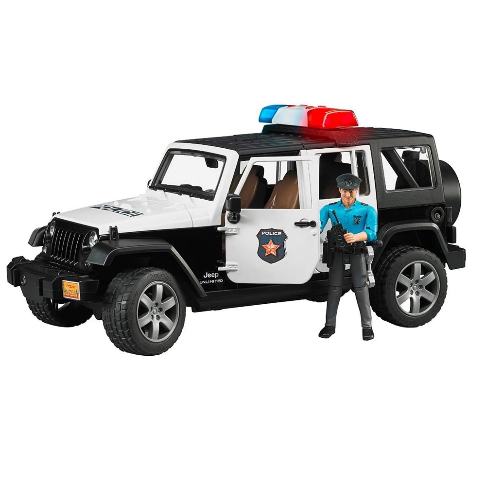 Il modello Jeep Wrangler Unlimited Rubicon è un fuoristrada dall’estetica straordinaria creato per il lavoro quotidiano della polizia e offre numerosissime funzioni per divertirsi giocando in modo praticamente illimitato. Oltre al tettuccio rimovibile a 2 segmenti, è possibile aprire anche il cofano motore, il portellone e tutte e 4 le portiere. Ovviamente, lo spazio non manca, e il veicolo può ospitare al suo interno anche quattro personaggi bworld BRUDER. In alternativa, è possibile rimuovere i sedili posteriori e inserire nell’area di carico vari accessori fissandoli mediante i connettori standard BRUDER. Il piantone guida aggiuntivo consente un facile comando del veicolo dal tetto, e può essere riposto nel pianale quando inutilizzato. Gli assi sono ammortizzati in pieno stile fuoristrada e i pneumatici profilati presentano straordinari cerchioni di tipo SUV. La parte frontale consente, ad esempio, di fissare un verricello opzionale e, unita al gancio di traino rimovibile, consente di creare combinazioni infinite nel mondo BRUDER. La versione polizia del modellino Jeep dispone di un nuovo modulo Light & Sound, dotato di quattro pulsanti di funzione (1° Suono motore, 2° Sirena della polizia, 3° Sirena vigili del fuoco, 4° segnale “yelp”). Il poliziotto bworld è dotato di tutte le opzioni per rendere più efficace il suo intervento. Il cinturone per la pistola con la torcia elettrica, la radiotrasmittente e il manganello sono gli utensili che servono per l’intervento. | Ditta Bruder | Codice 2526 | barcode 4001702025267