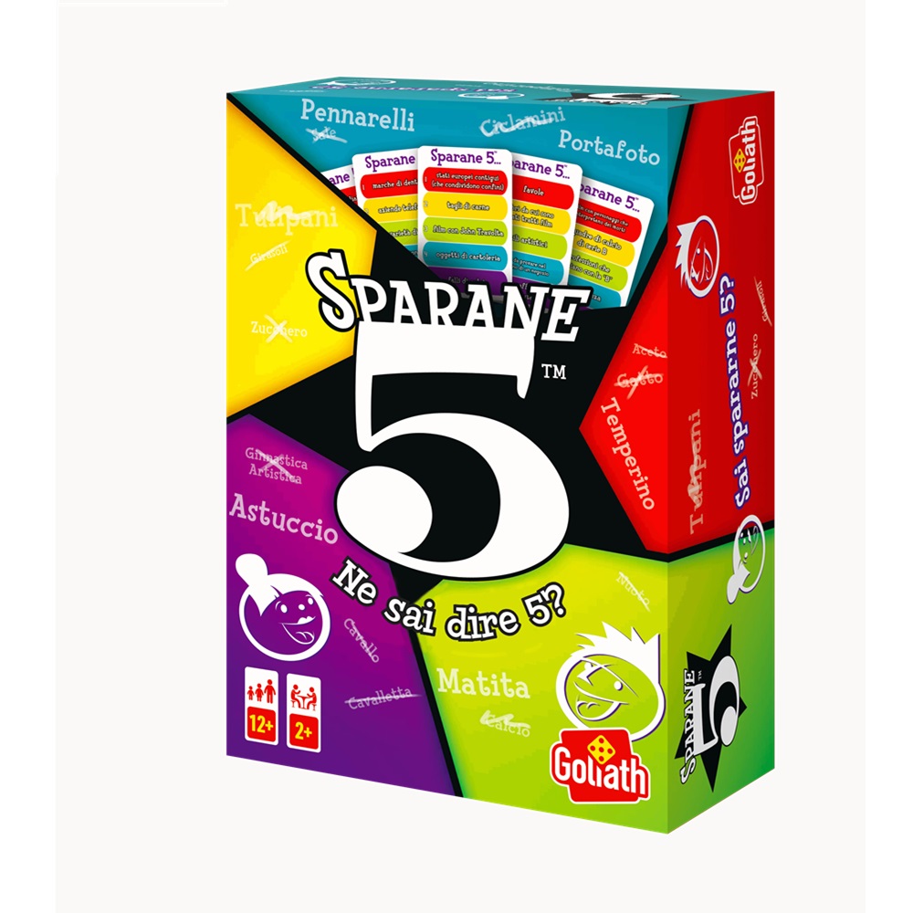 La confezione contiene: 165 carte “Sparane 5” (più di 800 sfide), 1 tabellone di gioco, 1 dado, 4 pedine, timer da 30 secondi, 1 manuale di istruzioni.