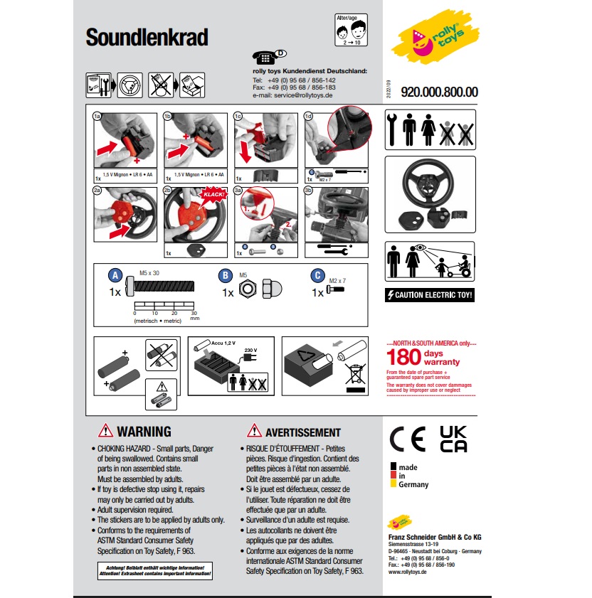 Il rollySoundwheel è compatibile con tutti i veicoli Rolly Toys e può essere facilmente montato. Rappresenta un’aggiunta ideale ai trattori o alle macchinine giocattolo esistenti. Si prega di notare che per il funzionamento del modulo sonoro sono necessarie 2 batterie AA LR 6, non incluse nella confezione.